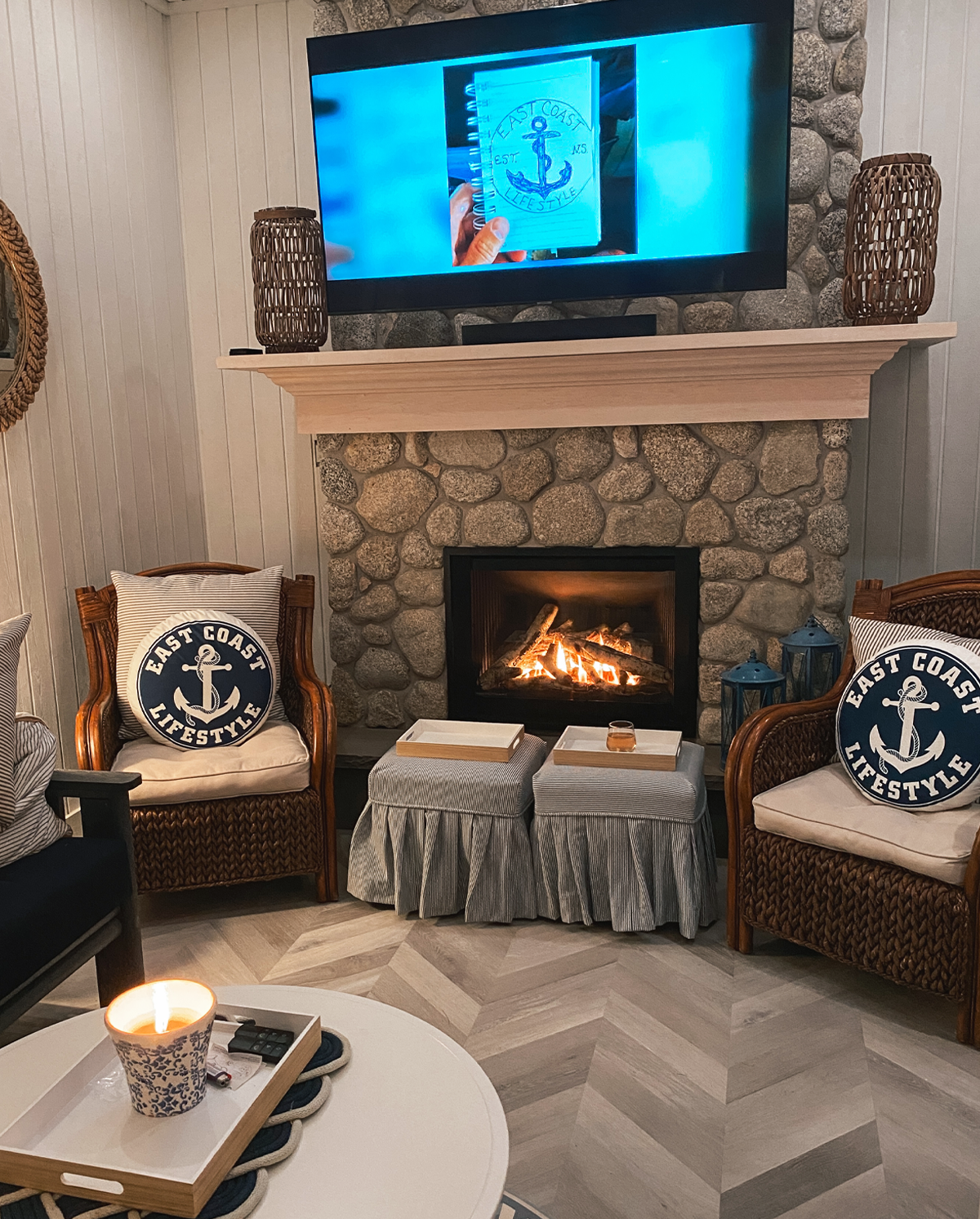 Bring coastal charm to any space with these ultra-soft white pillows, featuring a bold navy anchor logo for a clean East Coast vibe. Perfect for couches, patios, or cozy corners, they’re an easy way to elevate your décor.